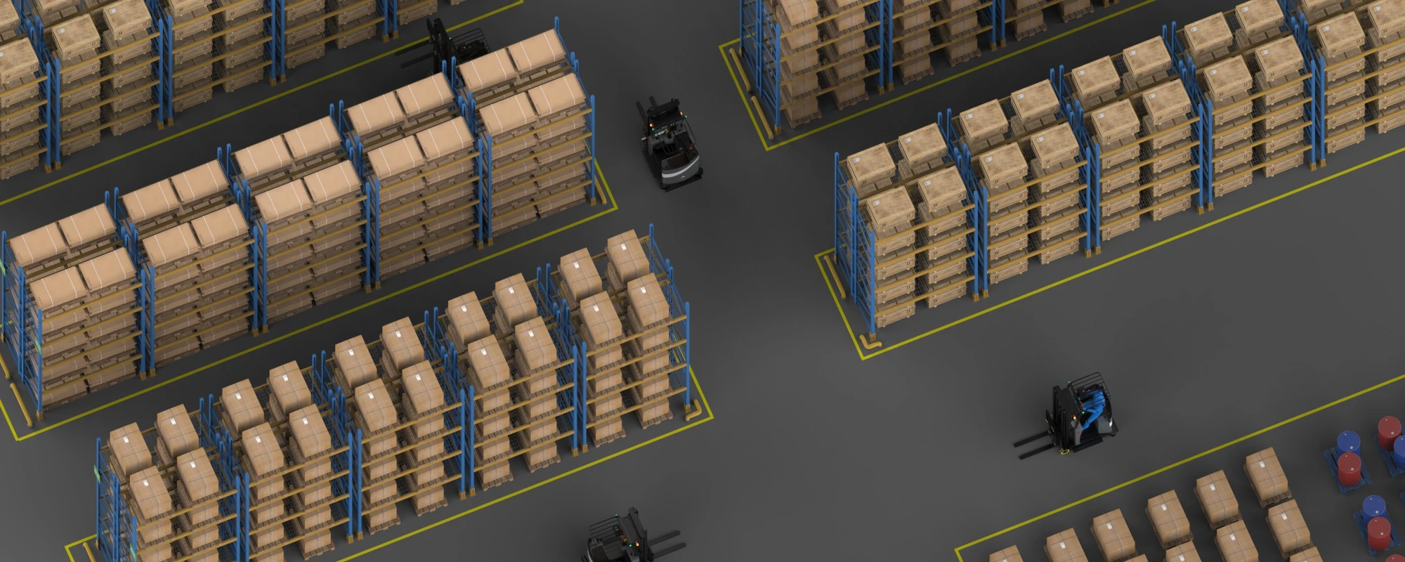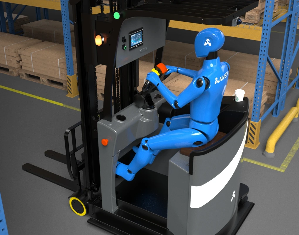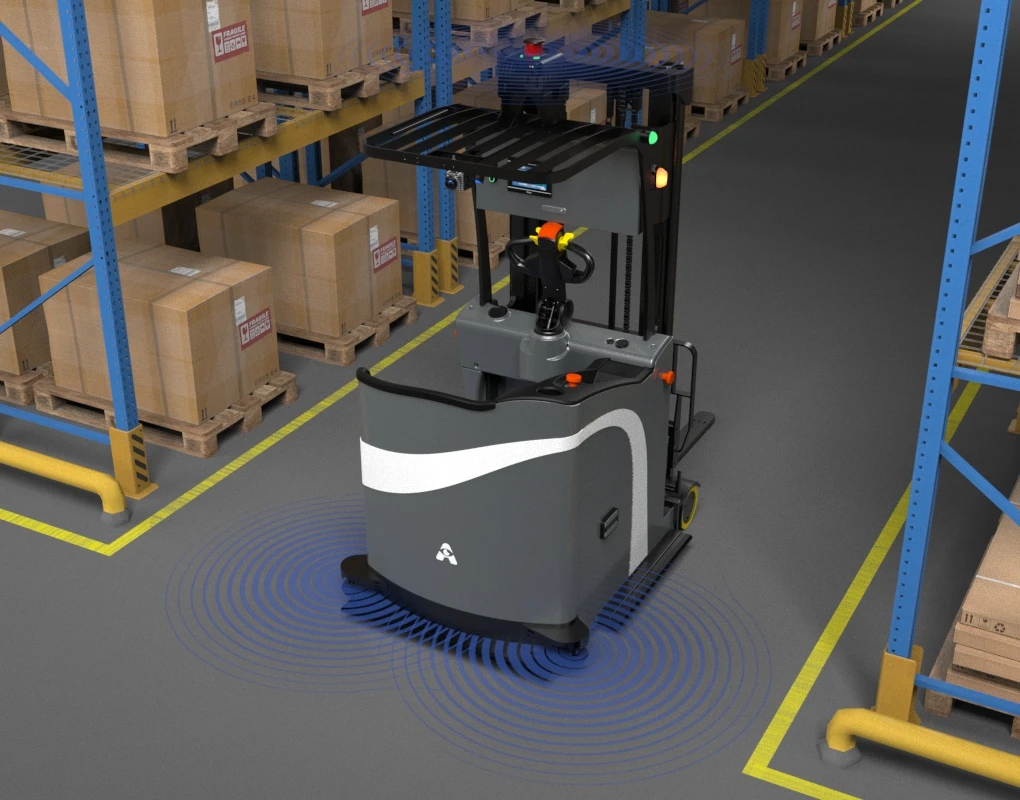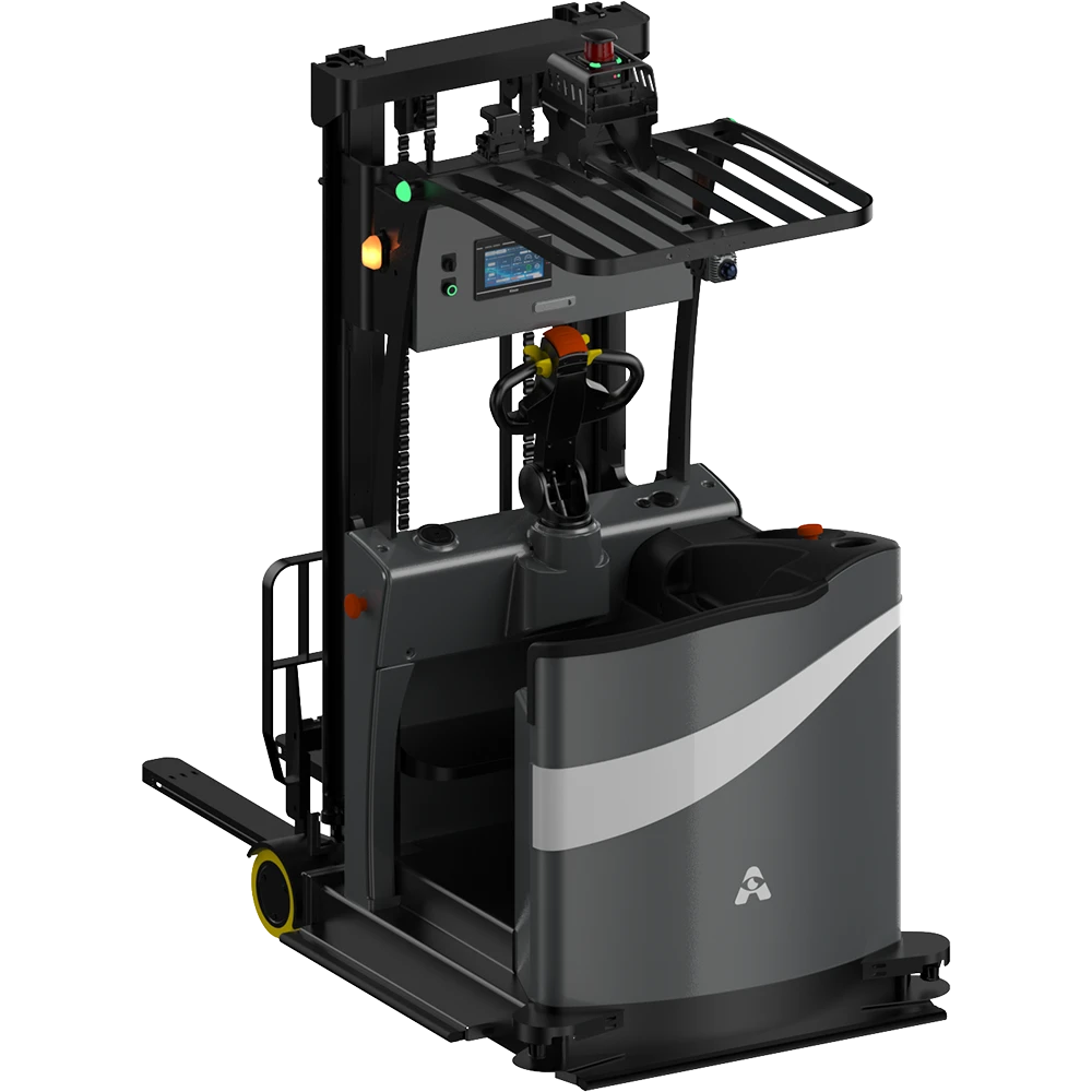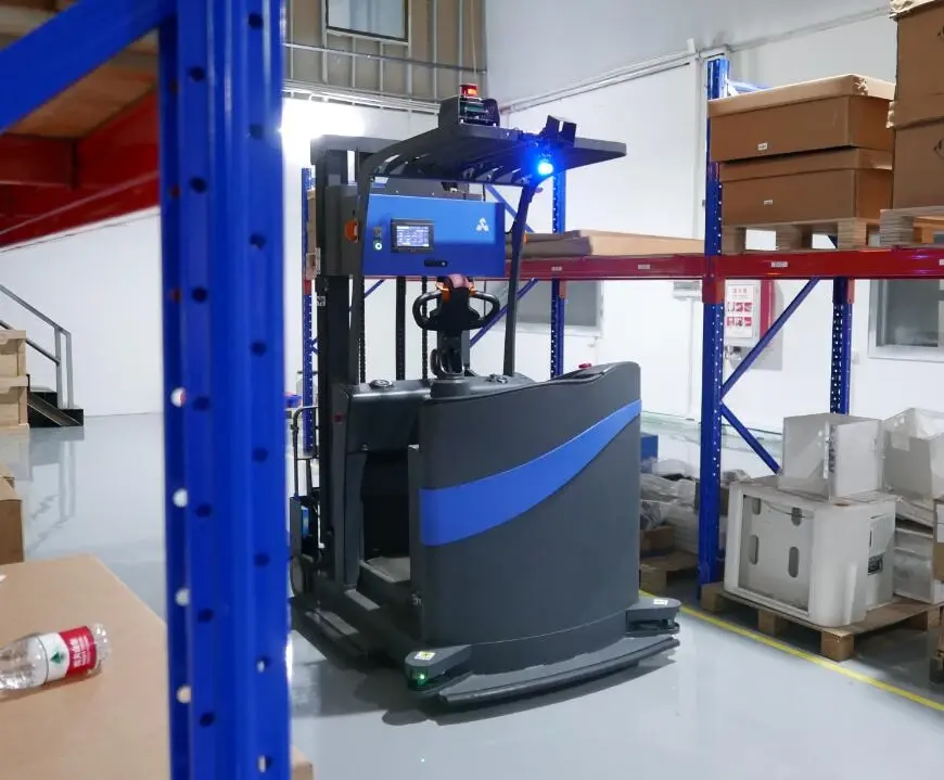 The forklift maintains the seated cab structure, enabling seamless switching between Autonomous mode and Manual mode. This capability allows human intervention for tasks that necessitate advanced operator precision.