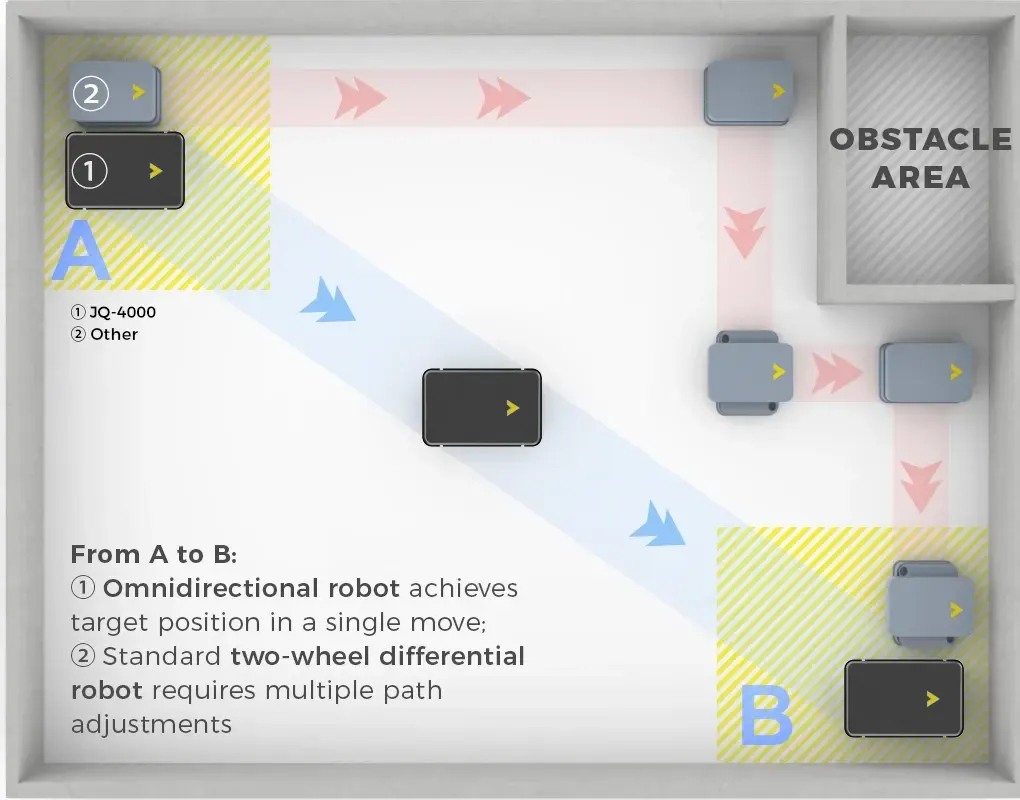 Omnidirectional robots simplify navigation logic and achieve precise positioning without repeated directional adjustments. This reduces transport time and enhances operational efficiency.